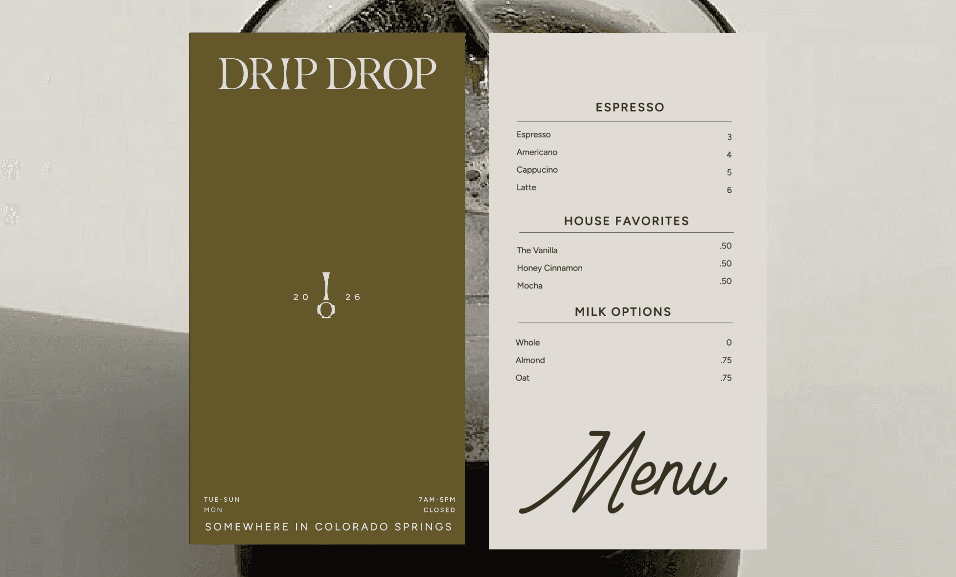Drip Drop Espresso Bar is a mobile coffee bar based in Colorado Springs, founded by two friends whose shared love of good food, community, and intentional living grew into a business. The brand lives at an interesting intersection: polished enough for weddings, relaxed enough for farmers markets, and rooted in genuine human connection.