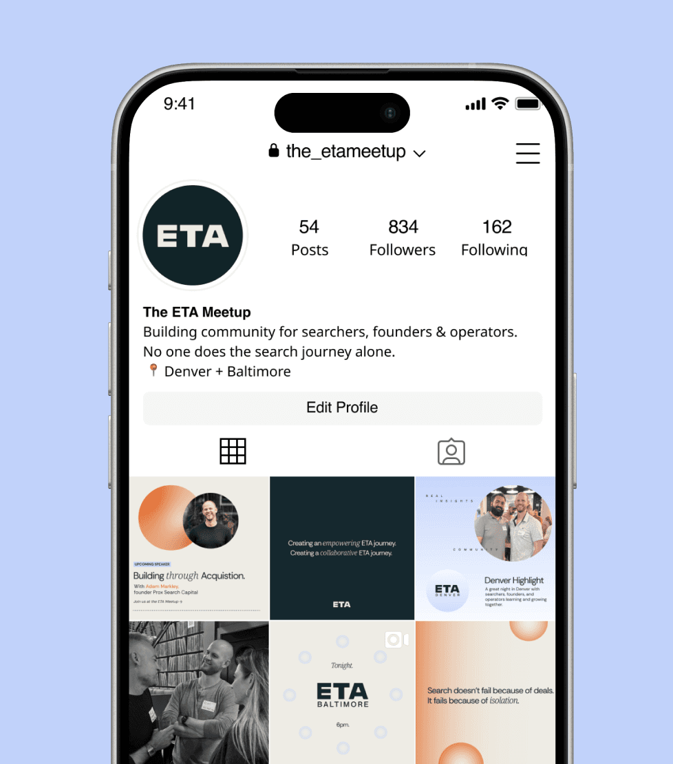 The ETA Meetup (Entrepreneurship Through Acquisition) came to us for a cohesive brand and website that positions the meetup as a credible, established community.